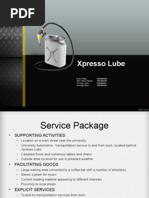 The presentation is a complete solution to the popular xpresso lube case study of services management. Xpresso Lube was found because Charlie had an unpleasant experience while getting his car oil changed. All similarities among and his fellow mechanics conclude there nevertheless.